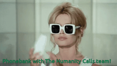 A woman in stylish white sunglasses holds a phone, promoting phonebanking with The Humanity Calls team.
