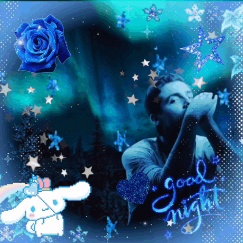 Humbe bids good night in a dreamy blue aesthetic with Cinnamoroll, stars, and a blue rose.