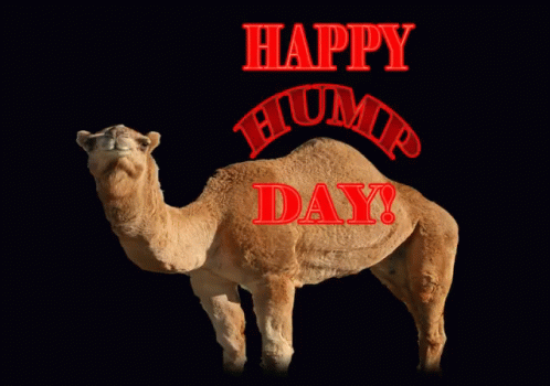 A smug camel stands against a black background, celebrating Happy Hump Day.