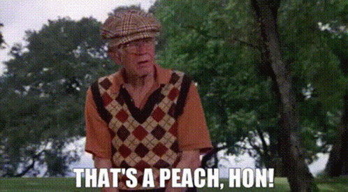 An older man in golf attire and a plaid cap exclaims, 'THAT'S A PEACH, HON!' on a golf course.
