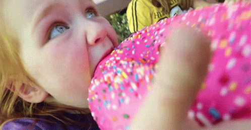 Adley, a little girl, takes a massive bite out of a huge pink donut covered in colorful sprinkles.