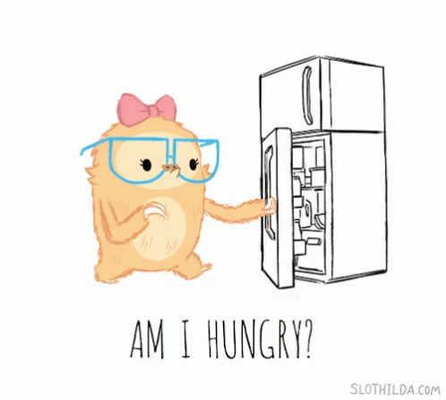 A cute cartoon sloth, Slothilda, ponders 'Am I Hungry?' while looking into an open refrigerator.