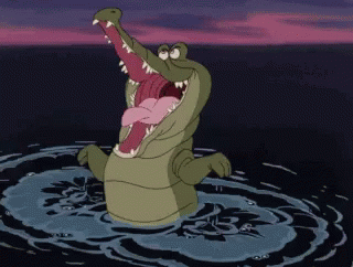 Peter Pan's gator emerges from dark water with its mouth wide open, appearing excited and hungry.
