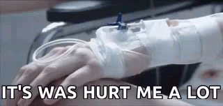 A person's hand with an intravenous drip, displaying the caption 'It's was hurt me a lot'.