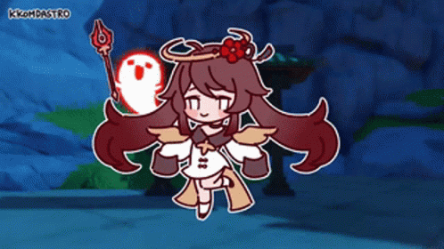 Hutao transforms from a cute angel-like figure to a fierce devil form, accompanied by her ghost companion.