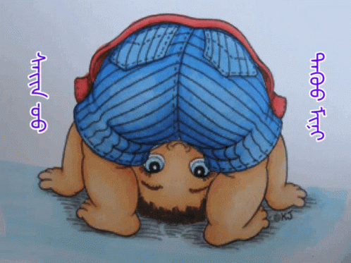 A charming cartoon drawing of a baby boy playfully bent over, with "I love you" written in Mongolian.