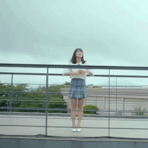 Actress Kim Hye-yoon joyfully spreads her arms on a rooftop, embodying freedom and happiness.