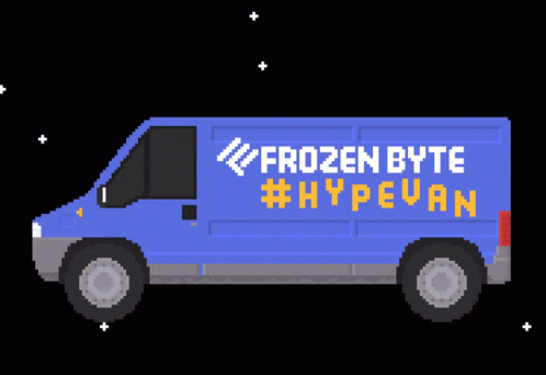 A pixel art blue van, known as the Hype Van, featuring 'FROZEN BYTE #HYPEVAN' branding, driving through space.