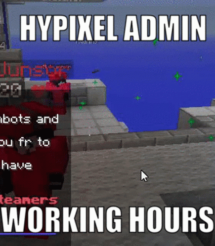 A humorous look at Hypixel Admins in Skyblock, featuring player characters R_Junsor and R_Lunar during 'working hours'.