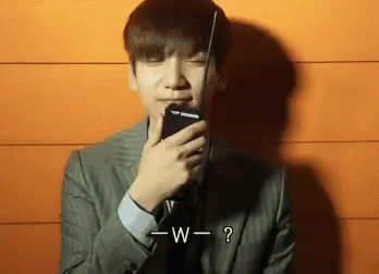 Hyuk from Vixx, dressed in a suit, holds a walkie-talkie to his face, with a caption '—W— ?' visible.