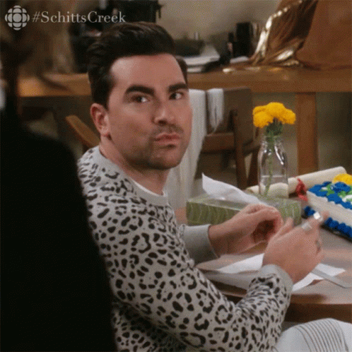 Dan Levy, portraying David Rose in Schitt's Creek, makes a dramatic statement in a leopard print sweater.