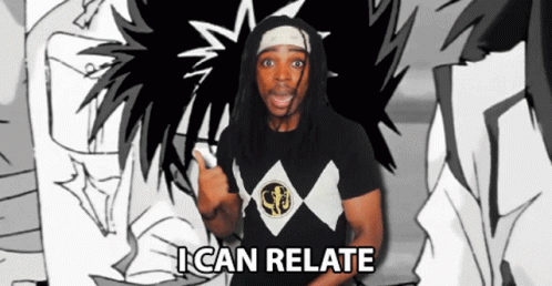 The Black Mastadonte expresses 'I CAN RELATE' in a black shirt with an anime background.