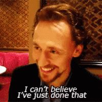 Tom Hiddleston reacts with laughter and embarrassment, covering his face while saying, 'I can't believe I've just done that.'
