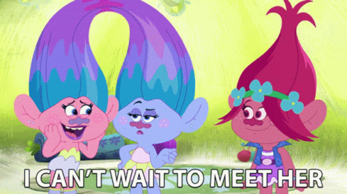 Satin, Chenille, and Poppy from Trolls express excitement with the caption 'I CAN'T WAIT TO MEET HER'.