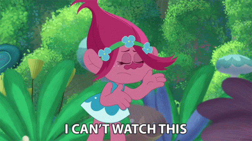 Poppy, voiced by Amanda Leighton, covers her eyes in the woods, exclaiming "I can't watch this."