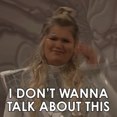 Prunella Pitz (Bailey Stender) in a mirrored costume expresses 'I don't wanna talk about this' with a dismissive look.