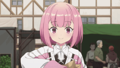 Pink-haired girl from 'I Don't Want To Work Overtime' happily enjoys a donut in a bustling market.