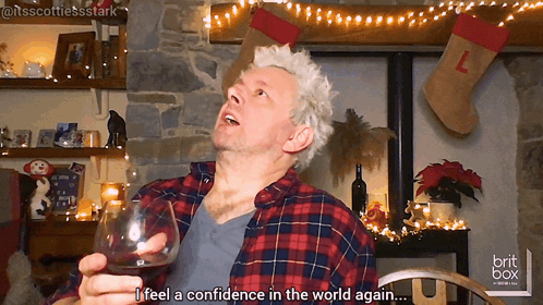 a man in a plaid shirt is holding a glass of wine and saying " i feel a confidence in the world again "