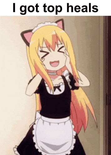 Anime maid character celebrating getting top heals in a game, expressing joy with the popular gaming phrase.
