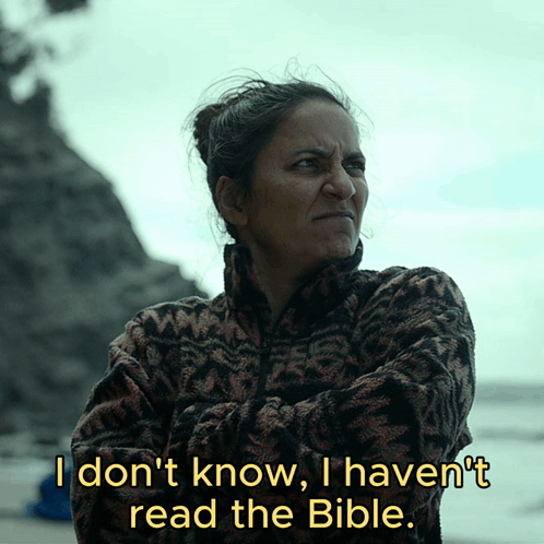 Madeleine Sami, with arms crossed, states 'I don't know, I haven't read the Bible' on a beach, referencing Eddie Redcliffe.