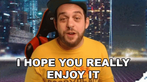 Doodybeard, wearing a yellow shirt, expresses 'I hope you really enjoy it' in front of a city skyline.