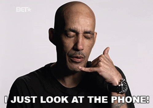 A bald man makes a call sign gesture with his hand, with the text "I JUST LOOK AT THE PHONE!" appearing. Features Ruff Ryders.