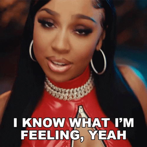 Lehla Samia in a red top, confidently stating 'I Know What I'm Feeling, Yeah' from her song.