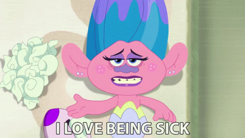 A Trolls character from 'The Beat Goes On' happily declares 'I Love Being Sick' while lying in bed.