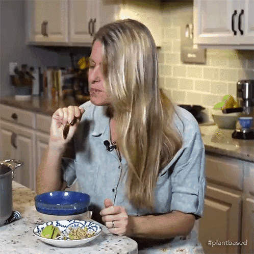 Jill Dalton tastes a plant-based dish in her kitchen, exclaiming 'I love the taste!' with delight.