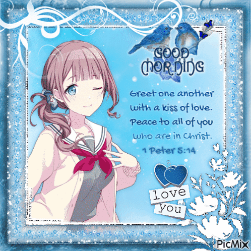 Honami Mochizuki from Project Sekai shares a good morning message with a Bible verse from 1 Peter 5:14 and a loving sentiment.