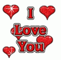 Animated 'I Love You' text surrounded by sparkling red glitter hearts, conveying a message of love.