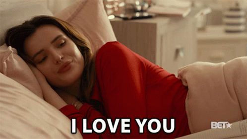 Bella Thorne lying in bed, wearing a red top, and saying 'I Love You' with a sweet expression.