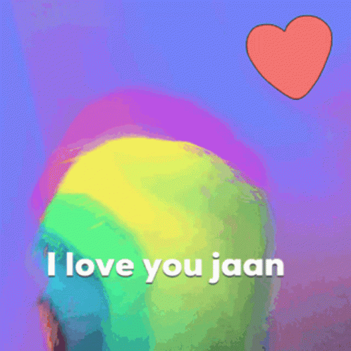 A vibrant, colorful animation displays the text 'I love you jaan' with a floating red heart.
