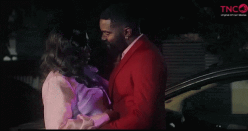A man in a red suit and a woman in a pink dress share a romantic kiss by a car, a true couple goal moment.