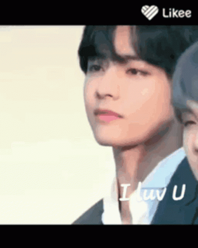 Kim Taehyung (BTS V) smiles sweetly with 'I luv U' text on screen, showcasing his charming expression.