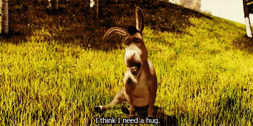 Shrek's Donkey sits in the grass, looking pensive and saying 'I think I need a hug.'
