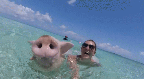 A woman joyfully swims alongside a pig in crystal-clear ocean water, capturing a fun selfie moment.