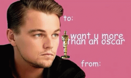 Leonardo DiCaprio featured on a Valentine's Day card with the text 'I want u more than an Oscar'.