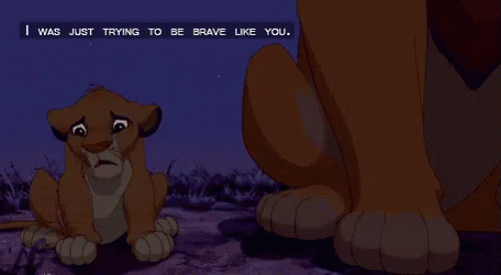 Simba, voiced by Jonathan Taylor Thomas, expresses his sadness to Mufasa, saying 'I was just trying to be brave like you' in The Lion King.