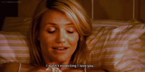 Cameron Diaz lies in bed, expressing surprise and emotion with the caption 'I wasn't expecting I love you..'