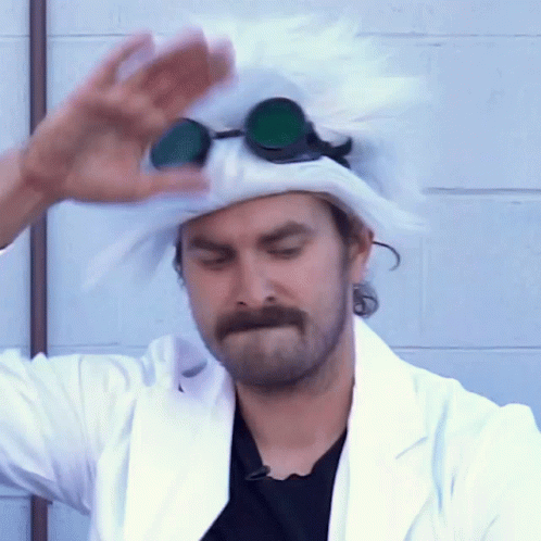 Zach Jobe, in a white lab coat and crazy wig, makes a humorous 'I Will Slap You' gesture.