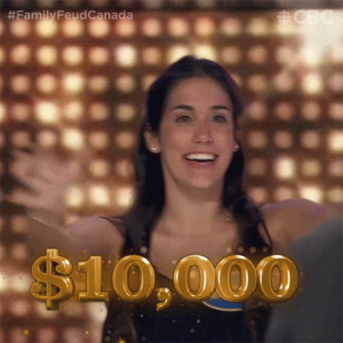 A woman celebrates winning $10,000 on Family Feud Canada, arms raised in excitement.