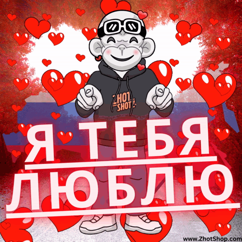 Cartoon monkey-like character in sunglasses and hoodie surrounded by hearts, declaring 'I love you' in Russian.