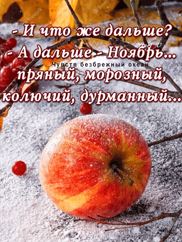A vibrant red apple nestled in fresh snow, accompanied by a meaningful Russian quote.