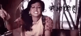 Hema Malini from Sholay, with an intense expression, saying 'मैं आ रही हूँ' (I am coming).