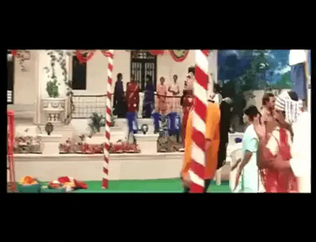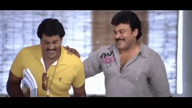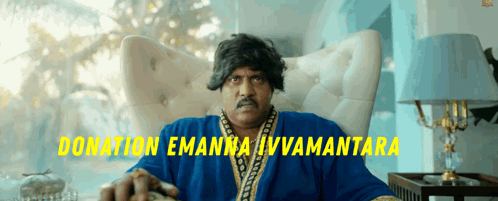 Actor Sunil in a blue robe, delivering a funny dialogue about giving a donation.