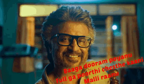 Rajinikanth from Jailer delivers a powerful Telugu dialogue, smiling confidently.