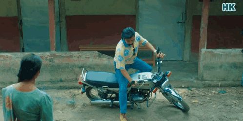 Suriya attempts to start a retro motorcycle in a scene from a movie.
