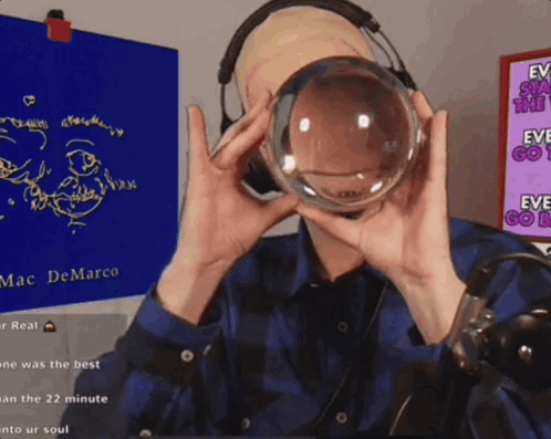 Ian H3 from Wrldwidewasteland holds a large clear sphere or magnifying glass in front of his face.