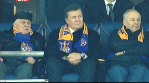 Former Ukrainian President Viktor Yanukovych stands up and claps excitedly at a football match.